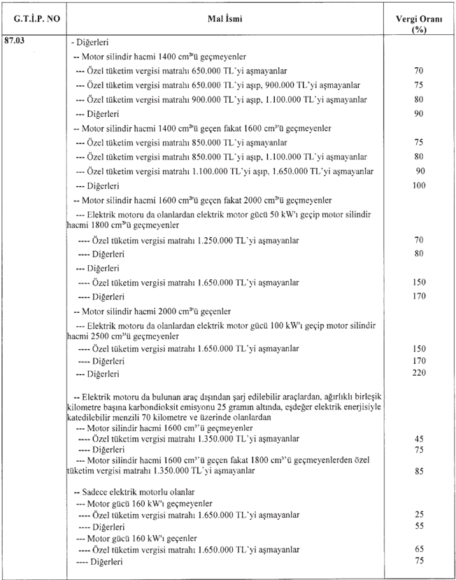 MADDE 1- (1) 6/6/2002 tarihli ve 4760 sayılı Özel Tüketim Vergisi Kanununa ekli (II) sayılı listedeki 87.03 G.T.İ.P. numaralı mallardan “- Diğerleri” satırı altında yer alan bazı mallar için farklı matrah grupları ile bu matrah gruplarına ilişkin oranlar oluşturulmuş ve malların özel tüketim vergisi oranlarına esas özel tüketim vergisi matrahları ile özel tüketim vergisi oranları aşağıdaki şekilde tespit edilmiştir.
